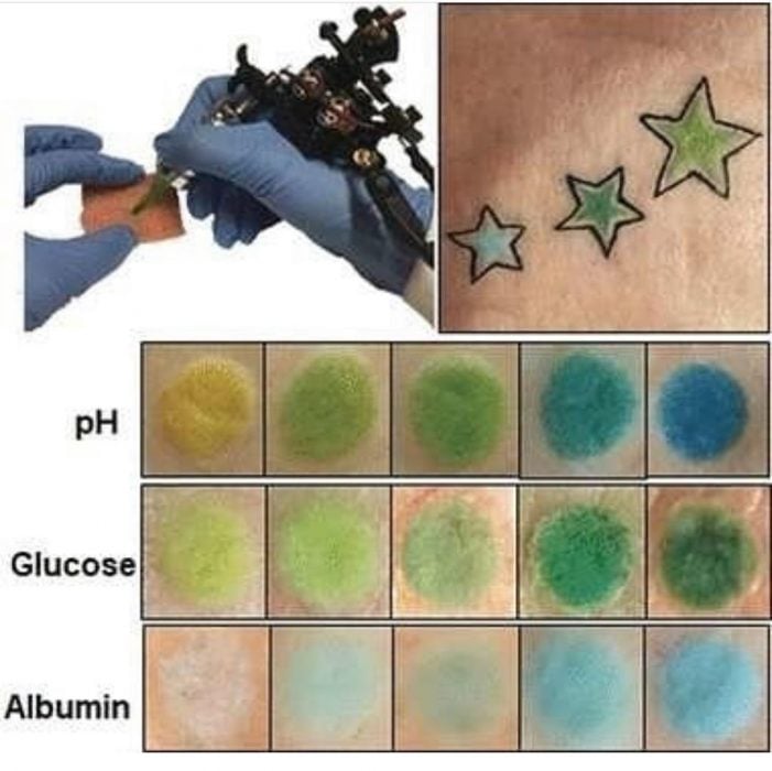 Ese líquido puede ser inyectado permanentemente en la piel, como si fuera un tatuaje, y sus sensores hace que las líneas cambien de color. Así, las personas pueden saber si su pH se hace más ácido, si les falta proteína en la sangre o sus niveles de glucosa subieron.